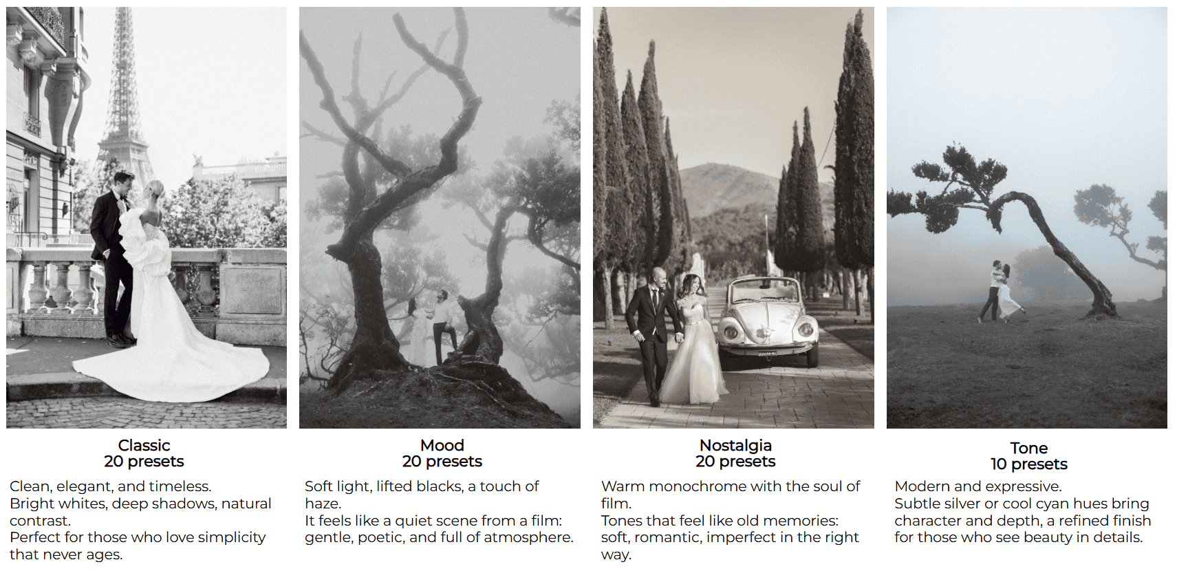 Whether you want clean elegance or cinematic emotion, this collection gives you endless ways to express the soul of your photographs — in black and white.