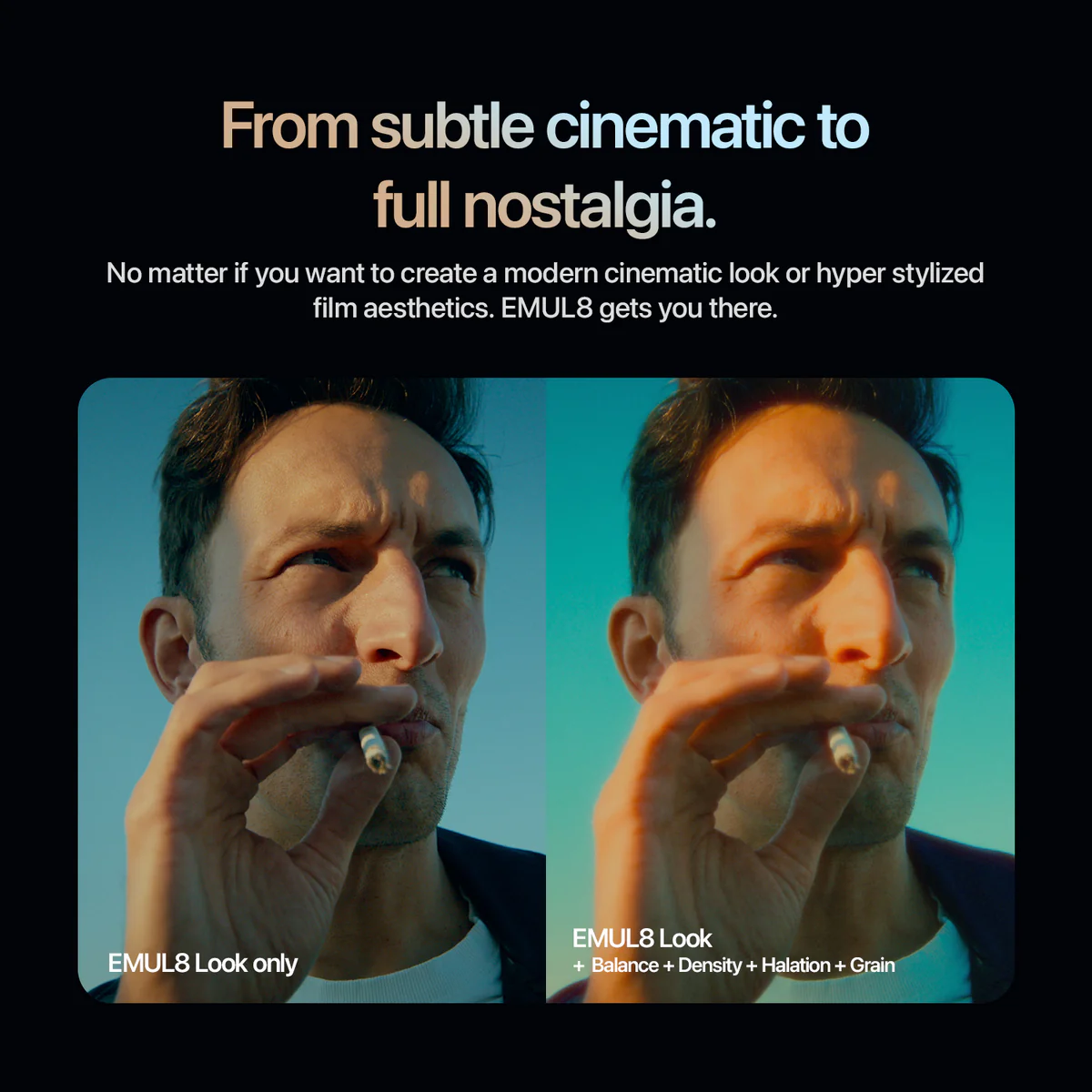 Real-time playback with bloom, halation, film grain and beautiful film looks. No lagging sliders. No features you don’t use anyway. Just pure film vibes.