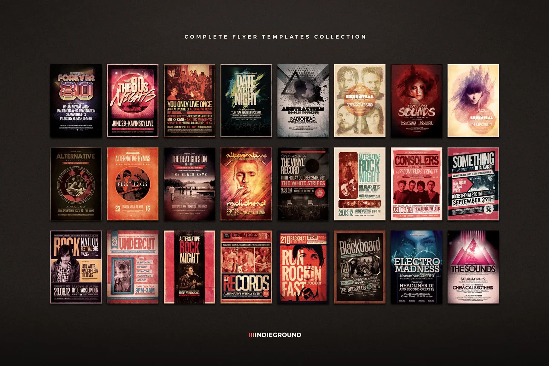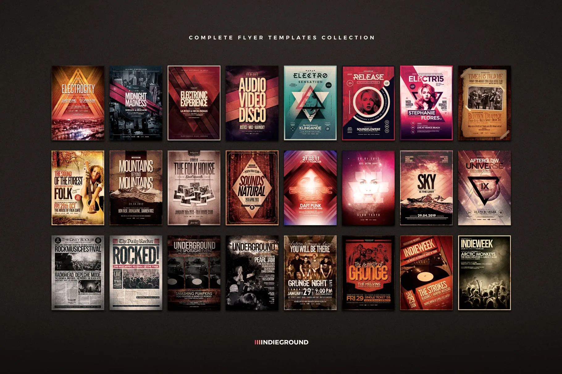Our complete flyers bundle, a collection of 114 flyer templates plus their variations, which totals a staggering number of 220+ fully editable PSD files. Here you will find all flyers you will ever need for promoting your music events. This collection includes templates for all kind of gigs, with a huge selection of different styles. All you have to do is pick the one that resonates with your event, edit it with your details, and hit save! All the best-selling flyers you get in this bundle are A4 format, ready to print and super easy to customise. Promote your event the quick and easy way with a flyer that stands out on the street, on your website, and on all social media channels!