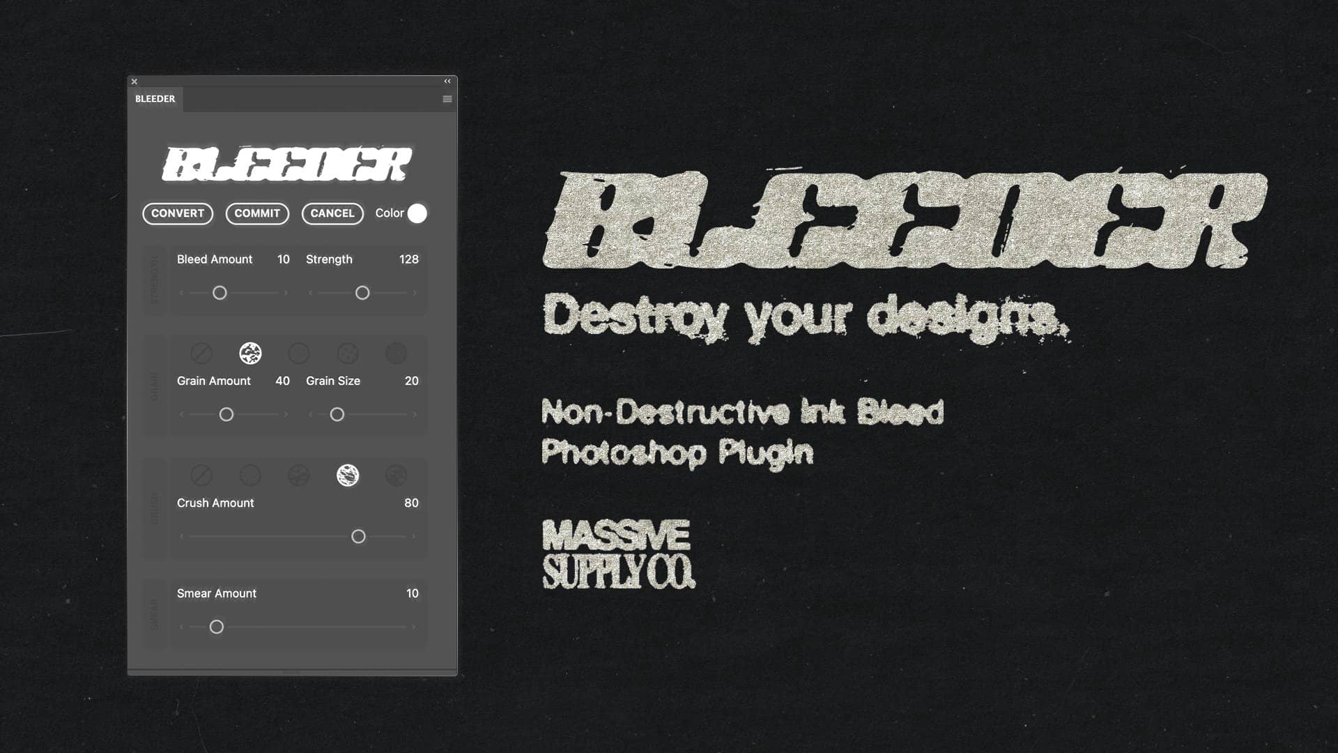 BLEEDER gives you the ability to fine-tune your ink bleed effects down to the pixel. Use the sliders to crank up the bleed amount or use the arrows to be more precise by adding subtle grain effects. With BLEEDER, you can adjust your effects until they are pixel perfect.
