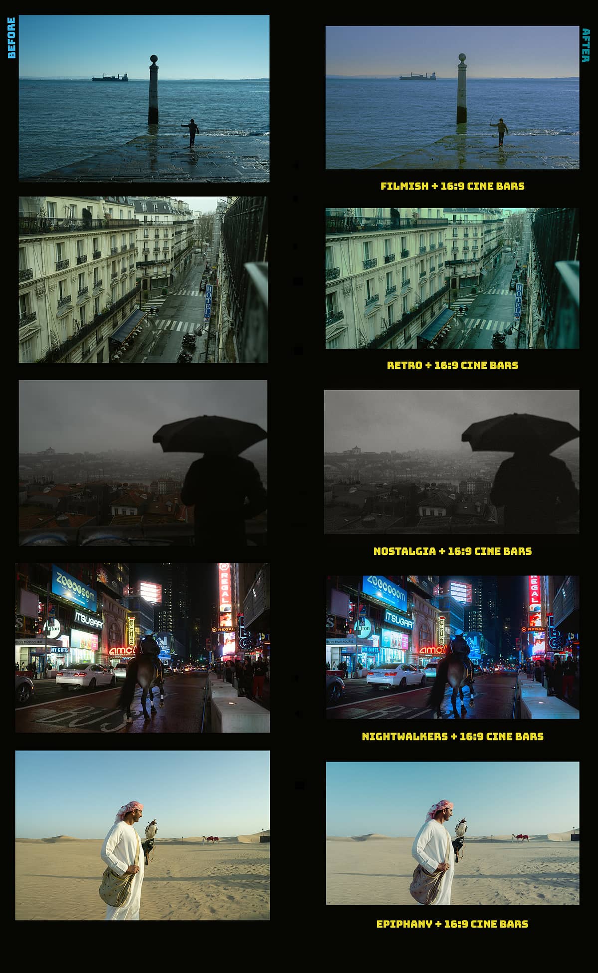 - 6 Lightroom Presets: Epiphany, Retro, Filmish, Nostalgia, Nightwalkers & Reverie — All crafted to give you a solid base for your edits. Don’t forget to adjust your white balance!